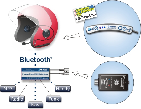 Ihre PowerCom-Anlage arbeitet noch mit Kabel-Helmsets? Kein Problem, mit diesem PowerCom Bluetooth Extension Set von AKE machen Sie den Kabel-Helmanschluss Ihrer PowerCom-Anlage Bluetooth fähig. Auch alle weiteren Funktionen, wie Radio, Navigation, Funk, Handy, etc. sind so kabellos nutzbar. Bluetooth-Betrieb wahlweise in Duplex oder Stereo.